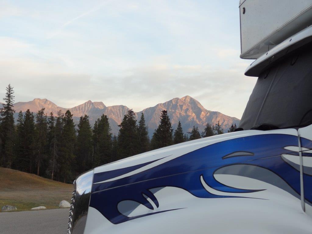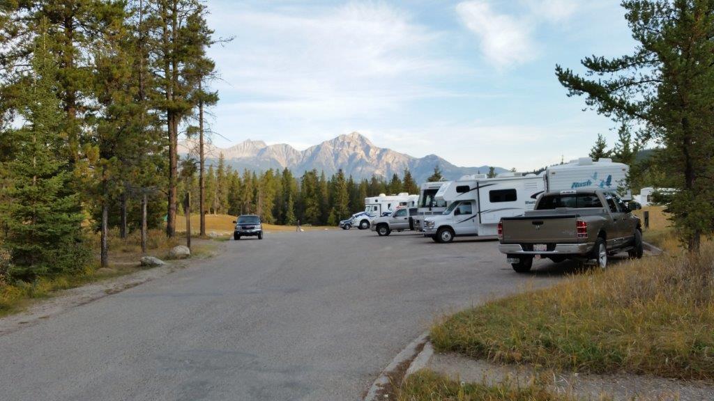 We arrived in Jasper and didn’t have a reservation at the campground…and this is what happens. We were relegated to the “Winter Parking lot”.  That was actually fine, we had power, a wonderful view, and no dirt was traipsed into Blue.