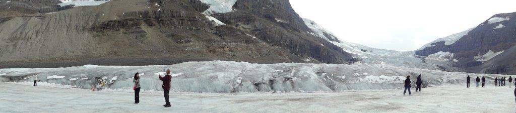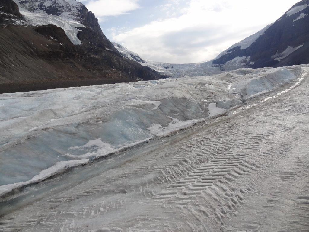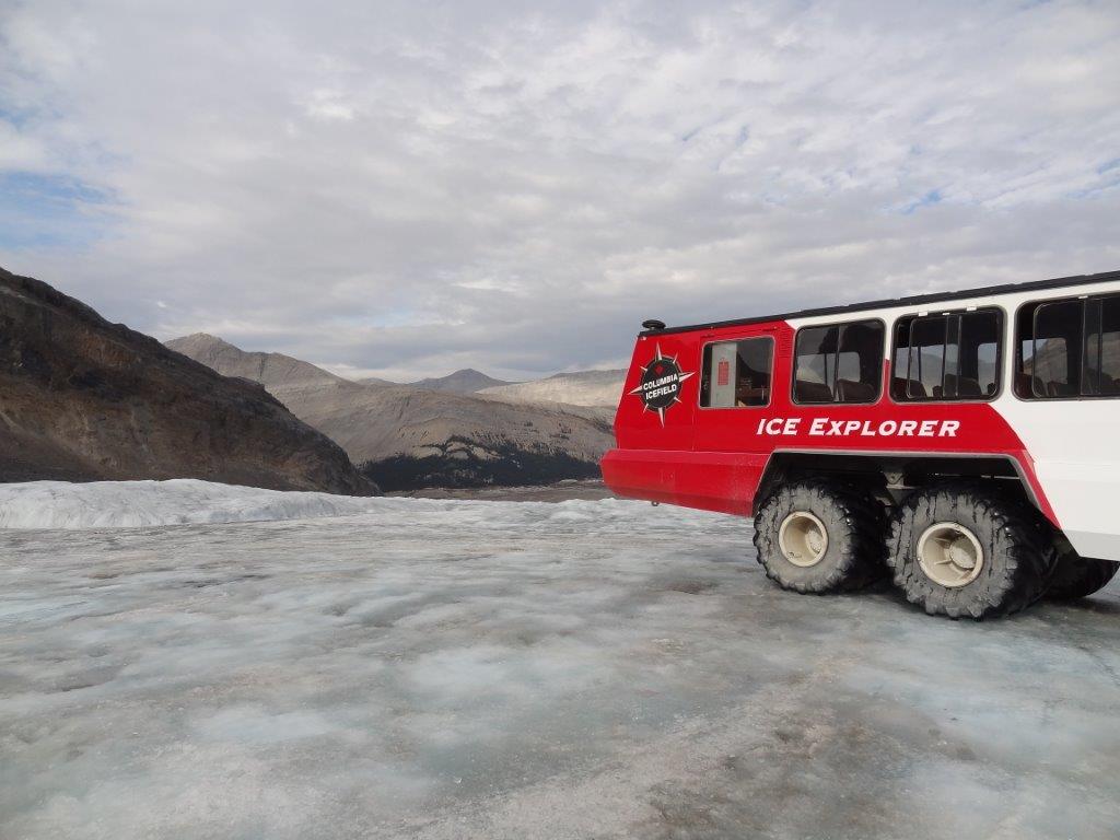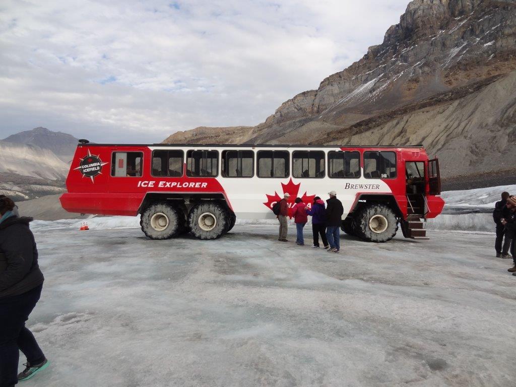 After playing in Jasper, we headed south and up in altitude to the Columbia Icefield.  This location is approximately halfway between Jasper and Banff.  We were up to around 6800 feet when at the visitor center…and I could tell.  We bought a ticket to take one of the “buses” out on to the glacier.  By the way, this is the only sight we repeated form our honeymoon!  The ice is way back from where it was in 1984.