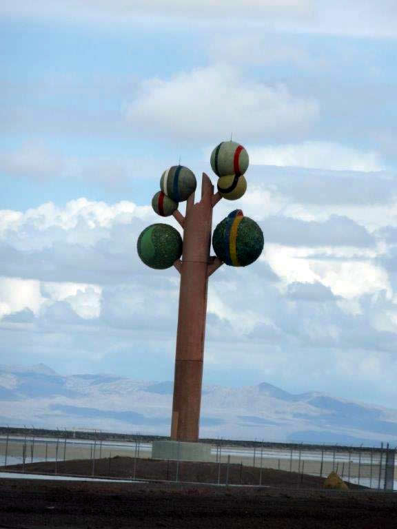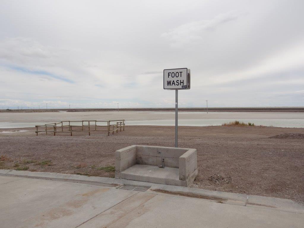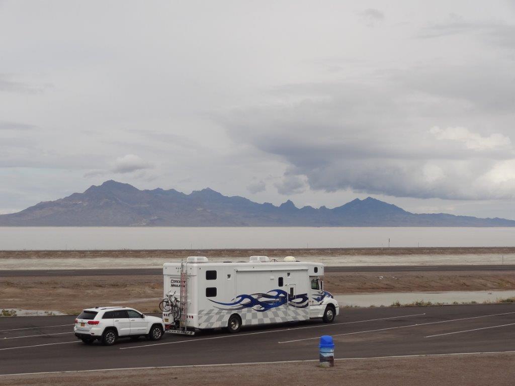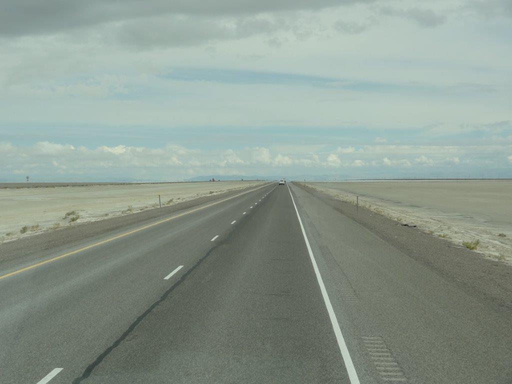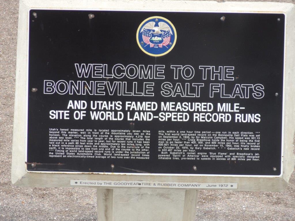 To get there, we had to go by way of Salt Lake City.  We knew west of Salt Lake City were the Bonneville Salt Flats.  If you have seen the movie “The World’s Fastest Indian” (the Indian is a type of motorcycle), you will know what we are talking about.  This is where all the land speed records are set.  We can now say we have seen the Salt Flats.  There was supposed to be a “speed Week” (people show up to drive fast!) when we were in the area, but recent rains have made the salt slushy.  So Speed Week was cancelled, and so was any desire by us to drive out onto the Flats.  We just admired it from a distance.