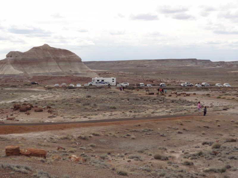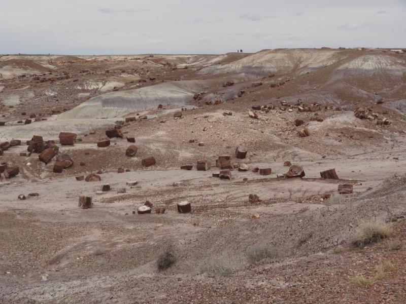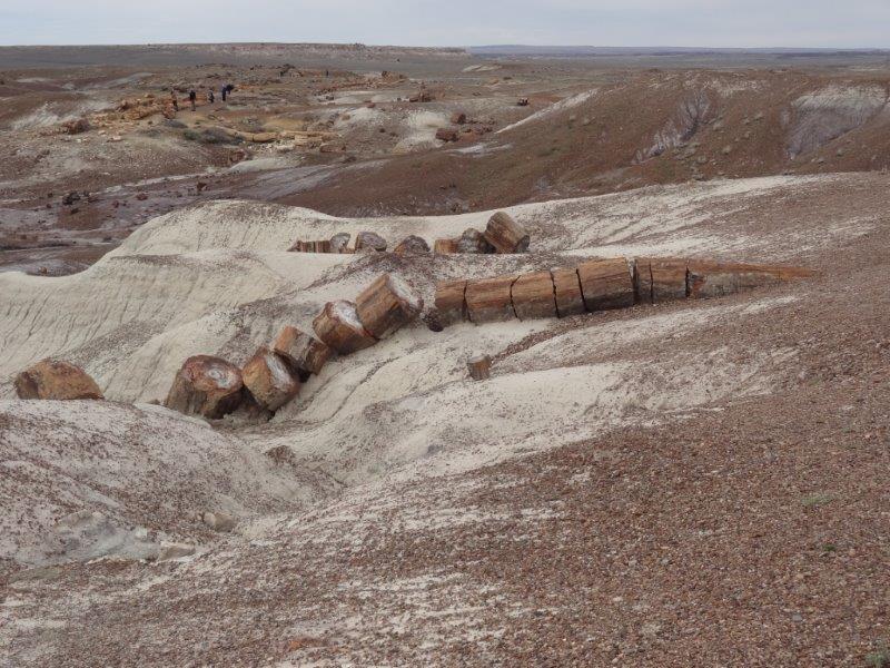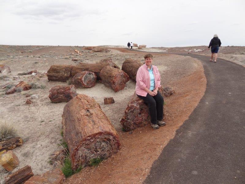 The Petrified Forest lies directly south of the Painted Desert, so we continued driving. How did they turn to stone? All these logs were tumbled by a torrential rain storm and rolled around until the limbs came off. Silica in the water created a chemical reaction with the cellulose in the wood, replacing the cells with the silica and turning the logs into stone. When the water receded, the stone logs were left. Really! It was amazing how much everything looked like wood. But when you touched a log, you knew it wasn’t wood. Amazing.