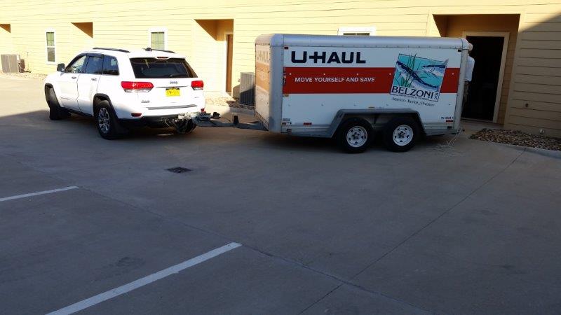 After much discussion, we came upon the scheme of the RV pulling a UHaul trailer with all Janelle’s worldly possessions in it.   The Jeep would be pulling a car dolly with Janelle’s car on it.  Hey, it’s only 1555 miles!  So, we packed the trailer and left a week ago.