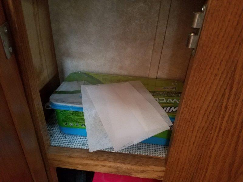 The biggest fear when storing an RV is rodents invading your space. We found zero evidence of mice. Yay! Granted, we took lots of precautions, such as leaving dryer sheets and bars of Irish Spring soap laying about. Some people believe the smell from these two will keep the critters away. I don’t know if it’s true or not. But every day we are finding soap and dryer sheets in and behind things.