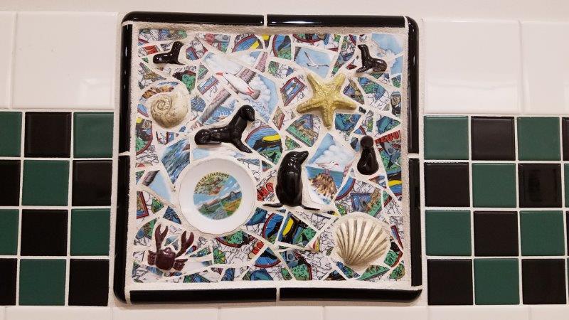 A close up of what is on the bathroom walls. These are broken up souvenir plates that were turned into mosaics. Cool!