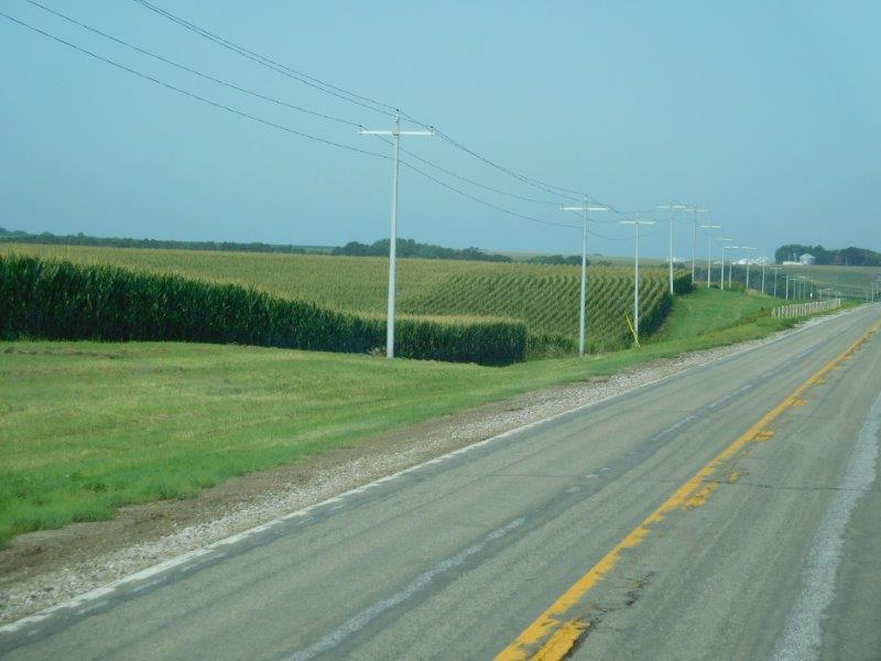 Here are the rolling corn fields of Iowa. Note the metal power poles. Is that so they can survive tornadoes?