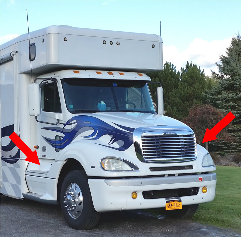 The red arrows show the location of the left and right saddle tanks. They run parallel to the length of the RV.
