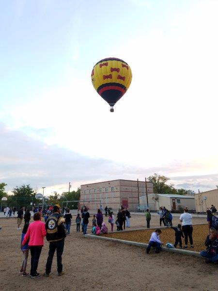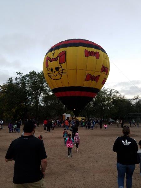 Our first exposure to ballooning happened the day before the Balloon Fiesta officially kicked off. We helped with Albuquerque Aloft. That is where pilots and their balloons head out to the schools to show local school kids what ballooning is all about. We were paired with a pilot named Keith Sproule. He’s from New Jersey, owns 16 balloons (visit http://skychariot.com/), and comes to the ballooning events at Letchworth, Dansville, and Wellsville (my fellow New Yorkers know where those places are…Mary Ellen is now hoping to get on his crew when he visits next summer). The name of Keith’s balloon is Ali Cat. He and his wife had just bought it, and this was their first flight in it.