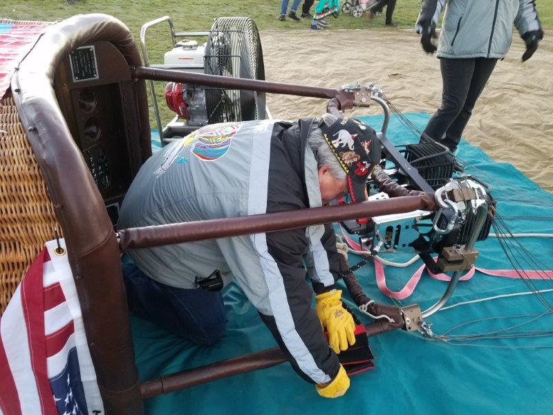 Mark has the balloon (also called an envelope) attached to the basket and is putting his radio on the basket upright.