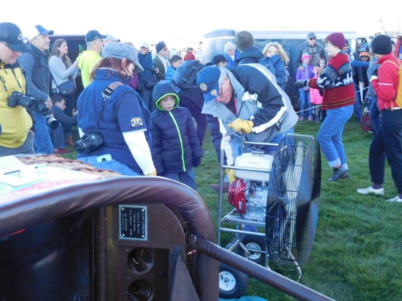 Cold inflation is about to start. This is the type of fan I mentioned earlier that clothing was getting sucked into (not us!!!). Tammy, standing to the left, was the keeper of the fan and kept people away from it. The fan is pointed at the bottom opening of of the balloon.