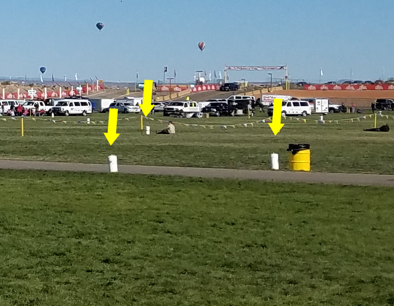 Mary Ellen and I joined the crew of the balloon called Big Top. Jim was with Major Award (Janelle joined us later that day). Saturday morning we wandered to our assigned grid locations. We were on L5 (red circle below). Jim was at the far end of the field at W5 (blue circle).