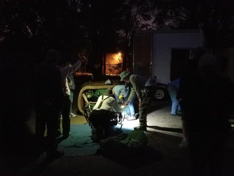 A tarp is spread out to protect the ballon from the wet grass. It also serves as a natural barrier to keep people off the balloon. Vicki and Dave are bundled up…it was cold until the sun came up.