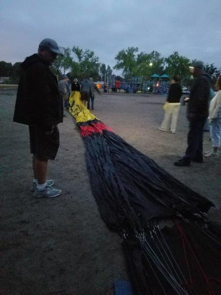 Brian showed up without a crew. The Boomers were there to help! Jim got a balloon ride his very first day of crewing. In fact, they landed in the box (that grassy area) next to our RV. Jim had a short walk home that day after the balloon was packed up!
