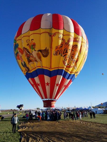 We found our grid and eventually found our pilot Mark. Mark and his crew are from Colorado. Big Top is a 30 year old, hand painted balloon that Mark recently acquired from his ballooning and real estate mentor. The balloon is very special to Mark and irreplaceable. Thus, he is a very cautious pilot. He only flew once during the Fiesta when he was sure of his landing spot…landing this balloon in a cactus covered field is NOT an option.