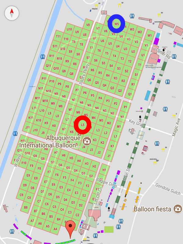 Mary Ellen and I joined the crew of the balloon called Big Top. Jim was with Major Award (Janelle joined us later that day). Saturday morning we wandered to our assigned grid locations. We were on L5 (red circle below). Jim was at the far end of the field at W5 (blue circle).