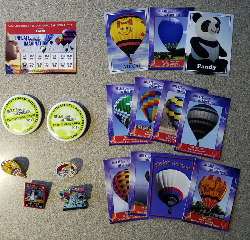 Did you know the Balloon Fiesta has trade-able goodies? Every balloon has trading cards with their balloon it (see the picture below…on the right). When crewing, you stick a pile of cards in your pocket. Kids come running up and ask “Can I have a card?” Of course! And you hand them out. I’ve never felt so popular! Kids had so many cards they could barely fit in their little hands. I only saved the cards from the balloons we actually interacted with. By the way, our balloon, Big Top, also gave out red clown noses!