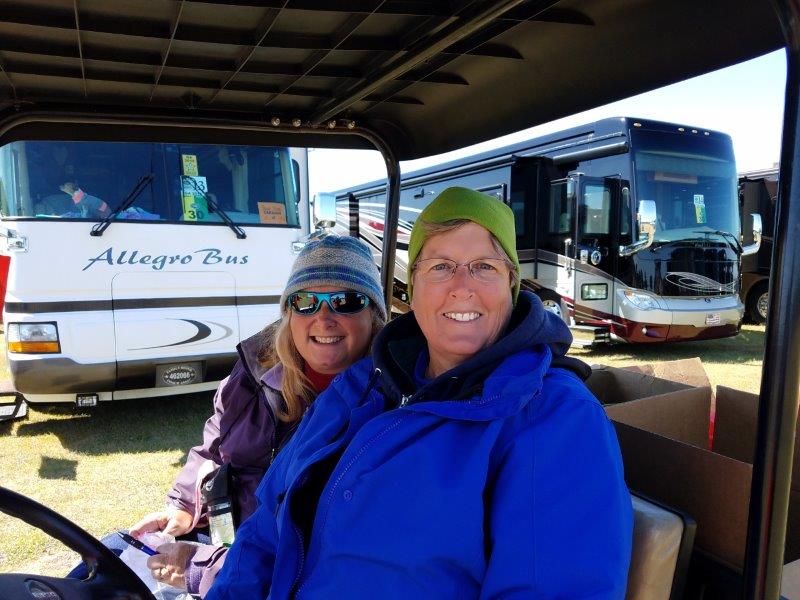 “We are the welcome bag ladies!” Here, Kay and I in our golf cart, with boxes of Welcome Bags behind us. “Here’s your bag.  Have a great rally.”  And yes, it was that cold.