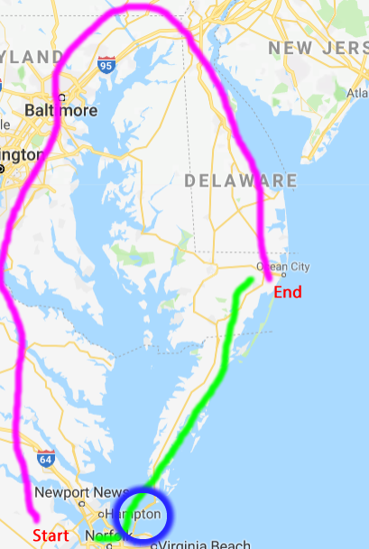 100 years ago, we would have had to take the purple route around the Chesapeake Bay. That’s a lot of time and miles. In this modern era, we were able to take the green route. That route includes the Chesapeake Bay Bridge Tunnel (inside the blue circle).