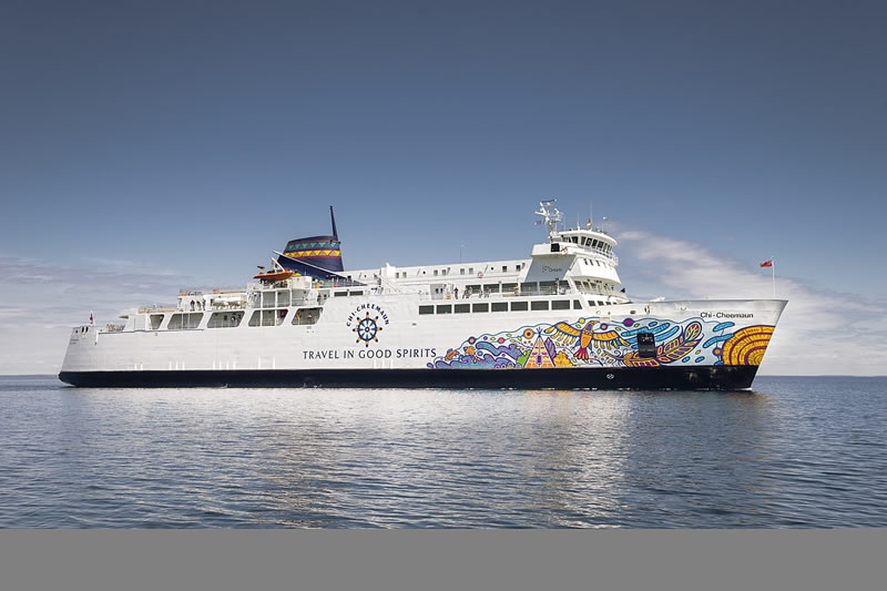 The Chi-Cheemaun Ferry (picture borrowed from their website).  You enter the boat through the open bow.  During the busy summer season, it makes four round trips a day!