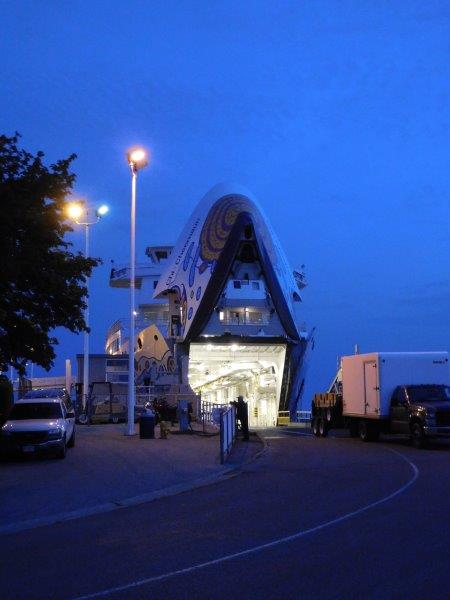 We had to be ready to go at 6:00 a.m.  We were but they weren’t, so we took a stroll.  You can see the bow is open and ready for the vehicles to come on board.