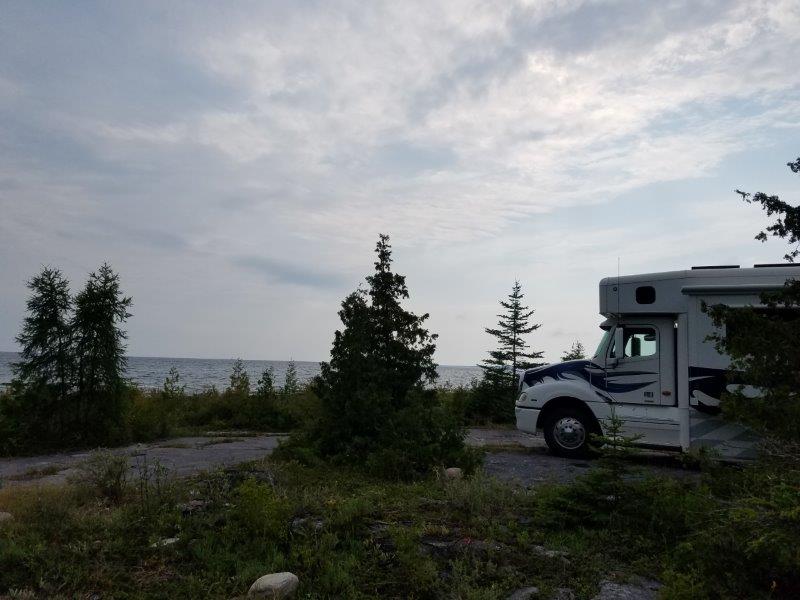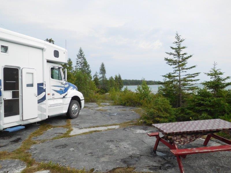 Where IS Manitoulin Island?  It’s forms the barrier between Lake Huron and Georgian Bay.  The ferry ride to get to the Island is the longer of the 2 red lines.  The bridge to leave the Island was the shorter of the two red lines.  We stayed at the red pin drop.  If we didn’t take the ferry, we would have had to drive all the way around Georgian Bay, north of Toronta.  We’ve done that before.  It was time for something new.