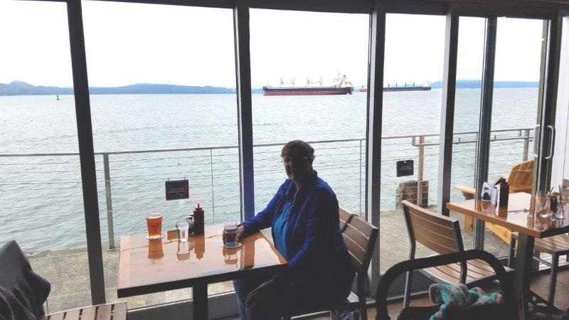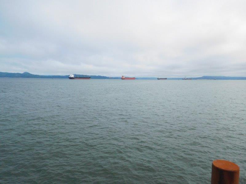 At any time, you can find ships anchored in a wide portion of the river off Astoria.  We found a knowledgeable local who explained why they are even there.  The ships are waiting to go upriver to their destinations (anywhere from Portland, Oregon all the way east to Lewiston, Idaho).  But they can’t go until there is room for them in their destination port.  So the ships anchor here because 1) there is no anchorage fee and 2) there is room for the boat to swing around so only one anchor is needed.  If they were further upriver, they would have to pay to anchor AND have to put two anchors down.  It’s like us parking at a Walmart for the night in the RV!
