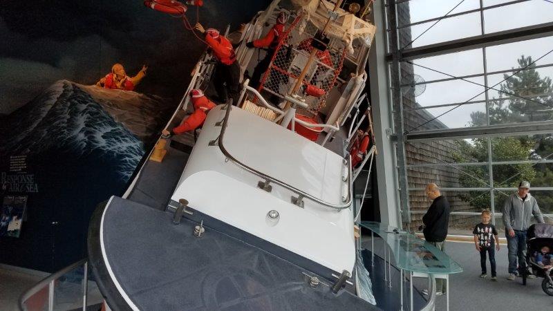 This is an actual retired Coast Guard Lifeboat on display showing what a rescue in rough waters would look like (the man overboard is on the left).  All the Guardsmen have on foul weather suits and are tethered to the boat.  The Guardsman at the helm is strapped into his chair.  The Lifeboat is designed to right itself if it capsizes.  This picture doesn’t do justice to the angle that the boat is at in these “rough seas.”  I got seasick just looking at it.