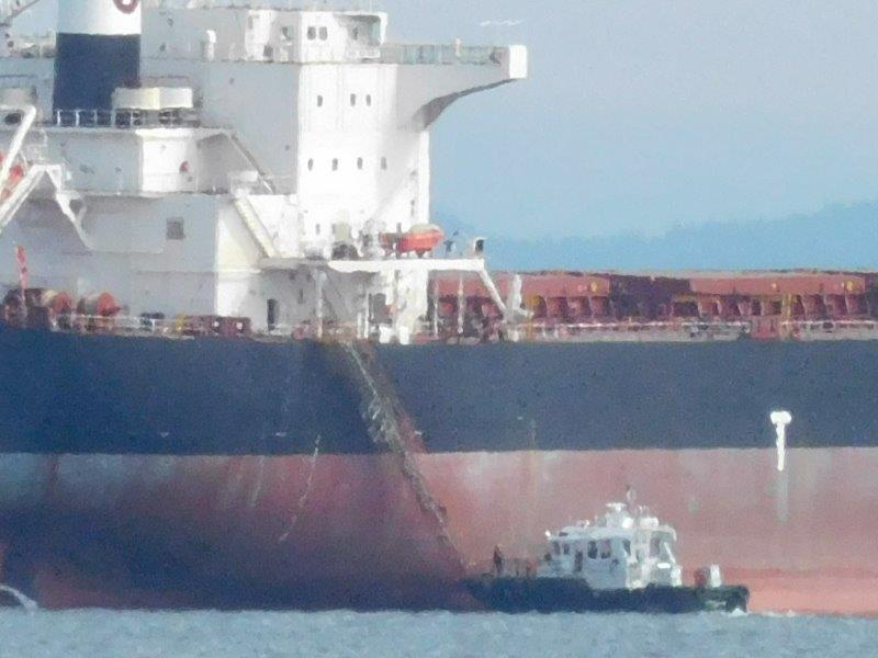 I did my best with my 20x optical zoom on my camera to capture a pilot going up the ladder.  Shortly after the pilot was onboard, it departed.  Jim checked later on MarineTraffic.com and found the ship was headed to load up with grain in Portland.