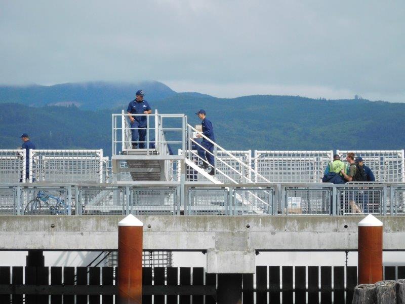 It apparently was reprovisioning day on the cutter.  We heard a call over the cutter’s loudspeaker calling all hands to the dock to bring on board all the crates being delivered by a Sysco Foods truck.