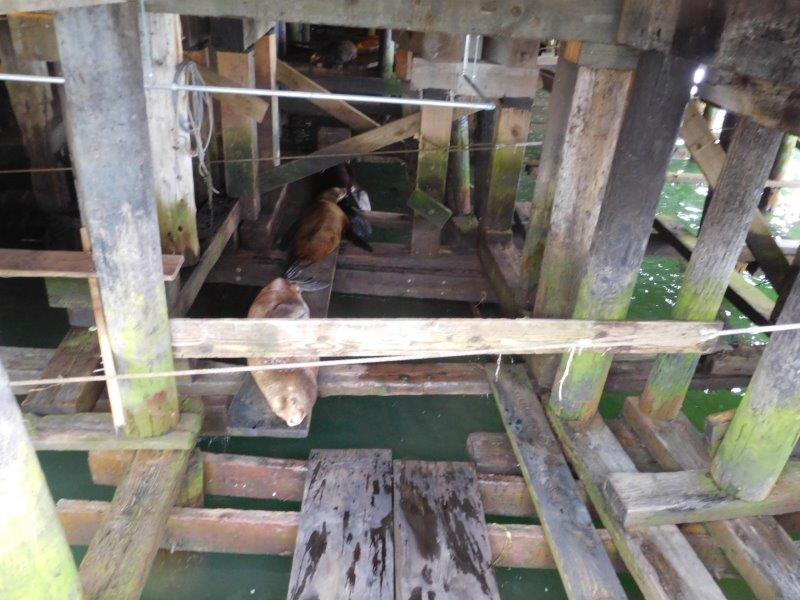 A walk around the outside of the buildings showed exactly what is happening under those piers!  Planks have been provided for the sea lions (and the tourists). You could hear sea lions barking all up and down the walk along the river.
