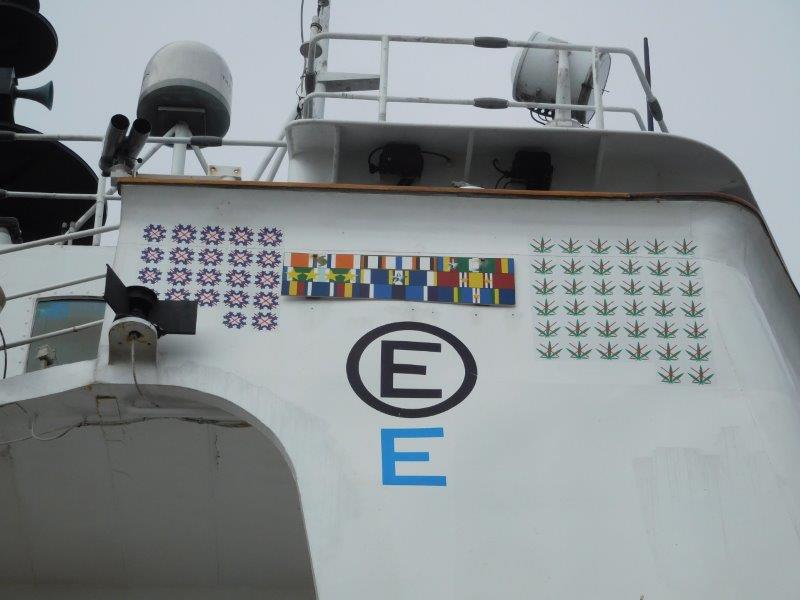 Later we got closer to the Coast Guard Cutter and spotted this on the side.  The leaves on the right side were obvious – the number of marijuana seizures made.  But the snowflakes on the left had us stumped.  I asked one of the Coast Guard personnel in the area what they represented.  Cocaine seizures!  Who knew?