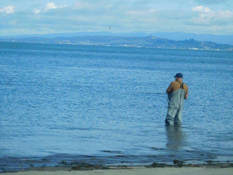 Before this gentleman waded in, I had the opportunity to quiz him.  They are fishing for salmon.  Pink lures work the best. Stay 25 yards away from your neighbor.  People show up at 4:00 a.m. to get their favorite spots in the morning.  No thanks, I’m still sleeping then. Still, it would be fun to do some fishing!