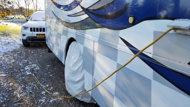 Anything running on 120 volts (like space heaters) was fine because it is being powered by 50 amp shore power.  The shore power also charges the lithium ion batteries that power all the 12 volt systems.  So Jim ended up outside at 5:00 a.m. moving the 120 volt space heater we had in the water line basement compartment to the lithium ion battery basement compartment.  With a little heat, within 10 minutes the batteries were back above 32 degrees and all systems worked again.  Phew.  That was a new one.  Lesson learned