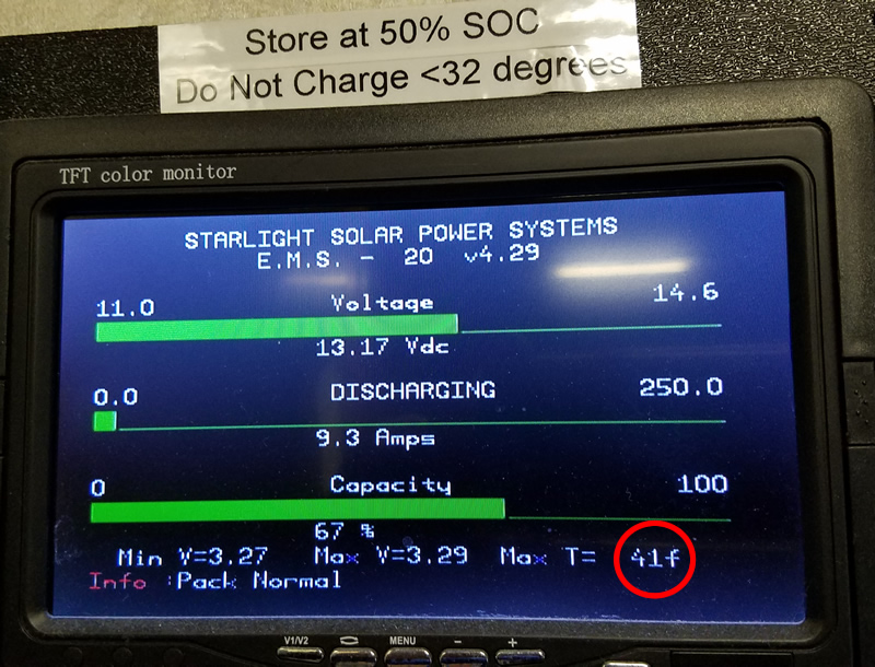 That number in the red circle is the crucial number, the temperature of the batteries. In this picture, things are fine.  But apparently anything low enough will cause the system to cease working and red errors are displayed. We KNEW not to charge below 32 degrees (note one of Jim’s fancy labels stating that). But we didn’t realize you couldn’t also use them if it got too cold!