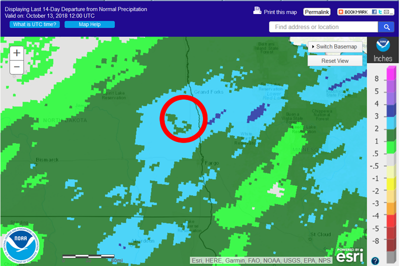 Jim found this graphic of how much extra rain has fallen since the harvest has started. The fields Sproule Farms is getting beets off of are all in the red circle…most of which have gotten 2 inches -above normal- of rain in the two weeks the harvest has been scheduled.