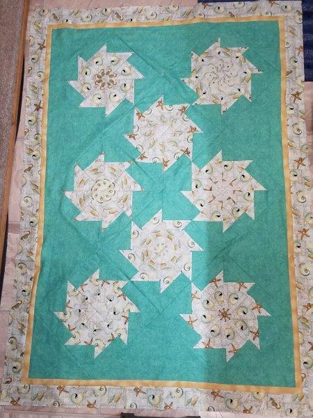 Janelle is president of the Texas A&M Galveston Graduate Student Association. Every Spring they do a silent auction to raise funds. I found some beach themed fabric in Grand Forks and stitched up this Stack and Whack quilt to donate.