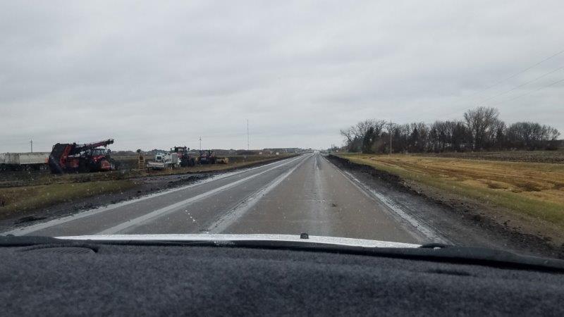 They had to bring out a scraper to get the mud off the road. All the equipment was sitting idle in the field on the left. Look at the shoulder on the right. We are used to seeing piles of snow on the side of the road. But mud?!?
