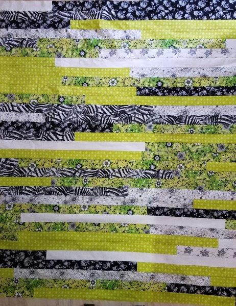 Finally, the last sugar beet harvest quilt. I had cut up some 2 1/2″ strips of fabric. A stack of strips rolled up is called a jelly roll. If you sew all the strips end to end and then sew edge to edge, you make a Jelly Roll Race quilt. This goes together really, really fast. Sewing guilds have been known to have actual races to see who can finish their quilt first. I did this one in one day. Again, I was using up my scraps. It may not be pretty, but it will be functional!