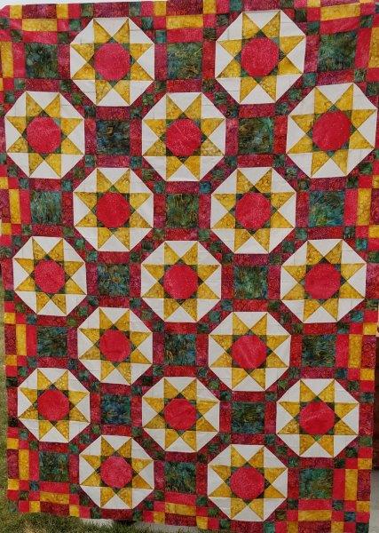 This is a mystery quilt I started while still at home. Once a month I would get a new set of instructions. I had no idea how it would turn out till the final set of instructions arrived, which happened on this trip.