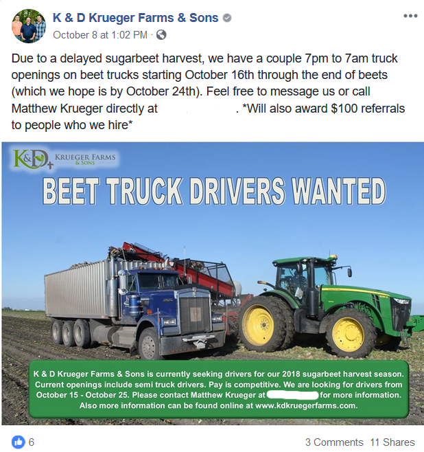 The farmers who hire people like Jim to drive the trucks are also scrambling to keep drivers here or are looking for replacement drivers. I spotted this on Facebook for one of the local farms. Jim’s employer has offered to pay for our campsite to keep us around.