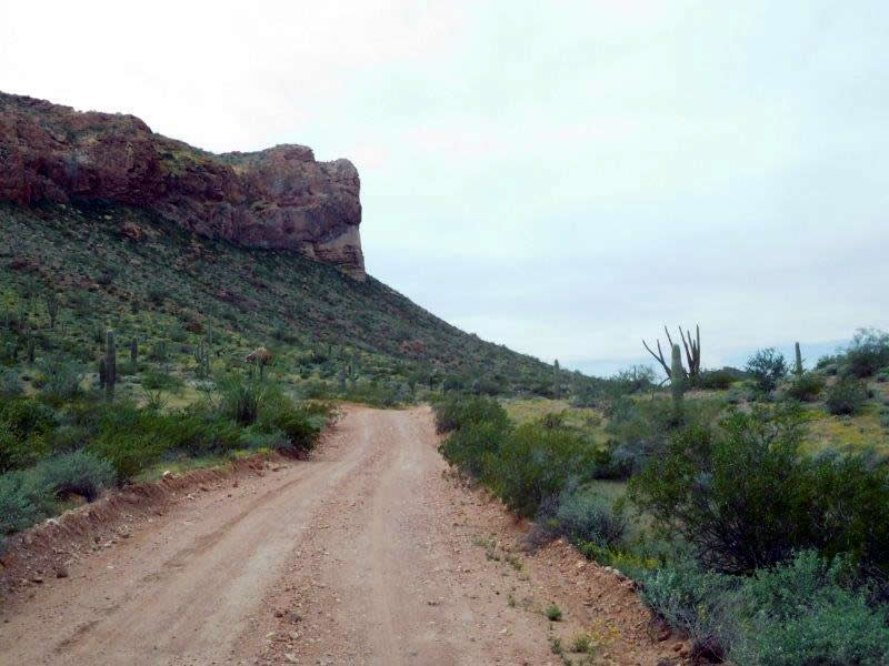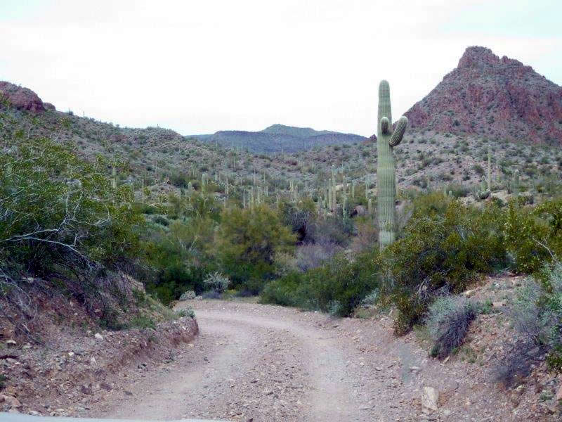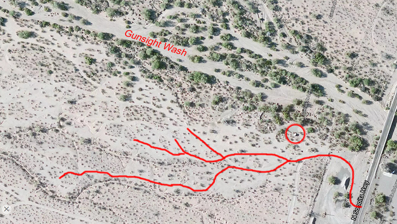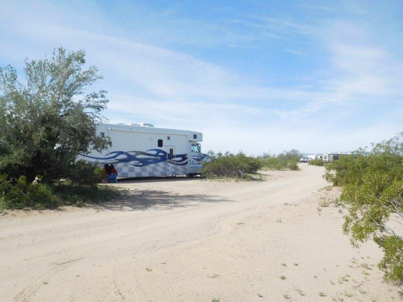 This is an aerial view of where we are at. I tried to find a picture with RVs in it, but no luck. There is a large wash to the north of us (thus the name Gunsight Wash). You pull in off the highway and follow all these dirt paths (I marked some with red lines) until you find a section of dirt that suits you. It is so hard to give a sense of scale to how immense this area is. Inside the red circle is an information kiosk about the size of a very small trailer. Jim walked down the dirt road about two miles and there was still more road to follow!