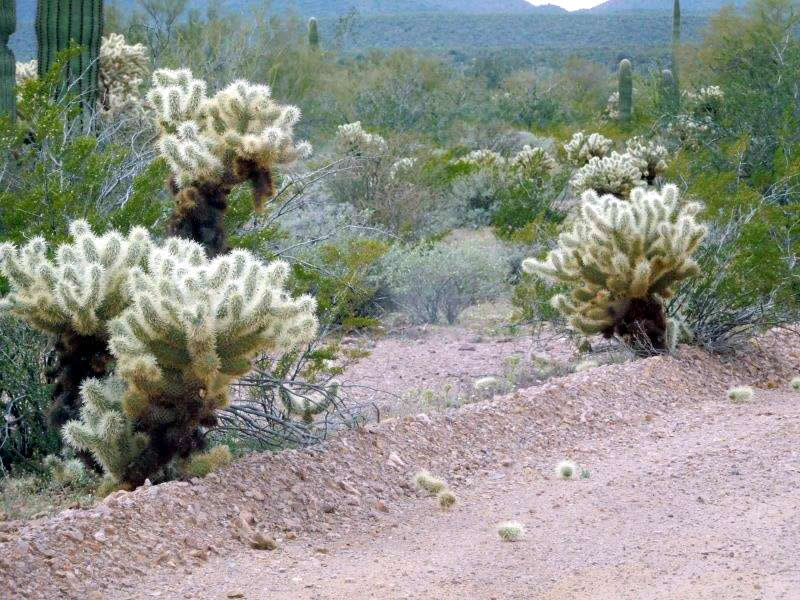 We learned something new this trip. The Cholla Cactus reproduces by growing pods that then fall off the plant. Animals (and people sometimes) walk by and the hairs on the pods attach themselves to the animal. The animal then transports the pods to a new location. This is the first time we had seen the pods actually laying on the ground waiting for a ride!