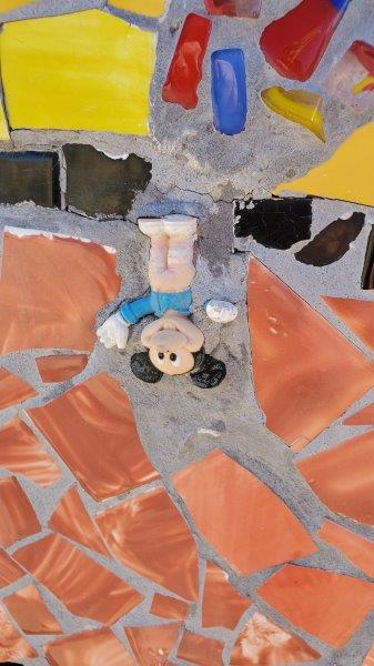 Looking closely at Sit Here! reveals all sorts of odd things. We found Mickey Mouse, albeit upside down, embedded in the grout.