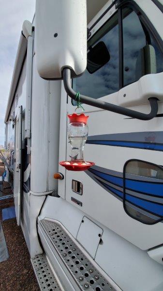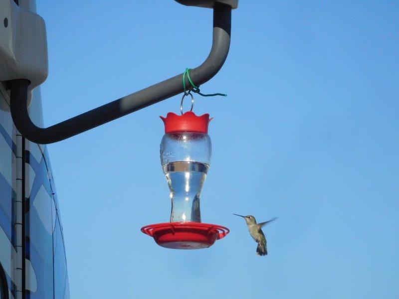 Earlier in the year I bought a hummingbird feeder for the RV. I made up some food and hung the feeder off our side view mirror.