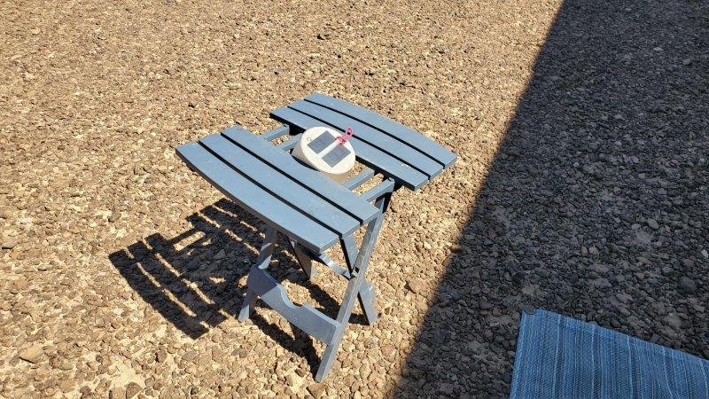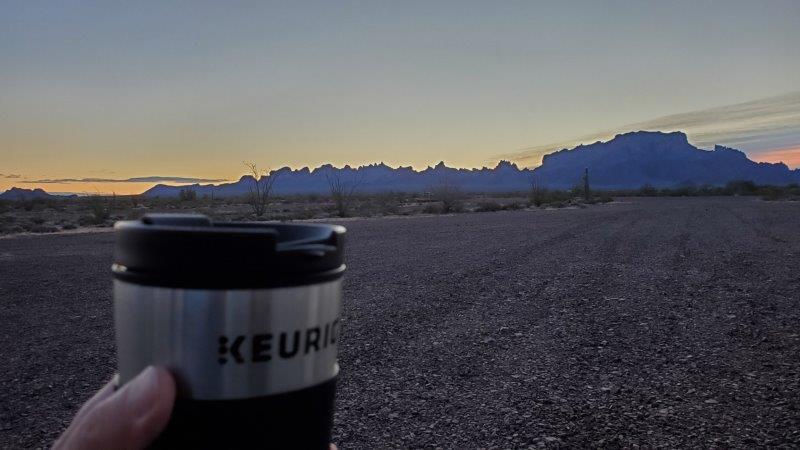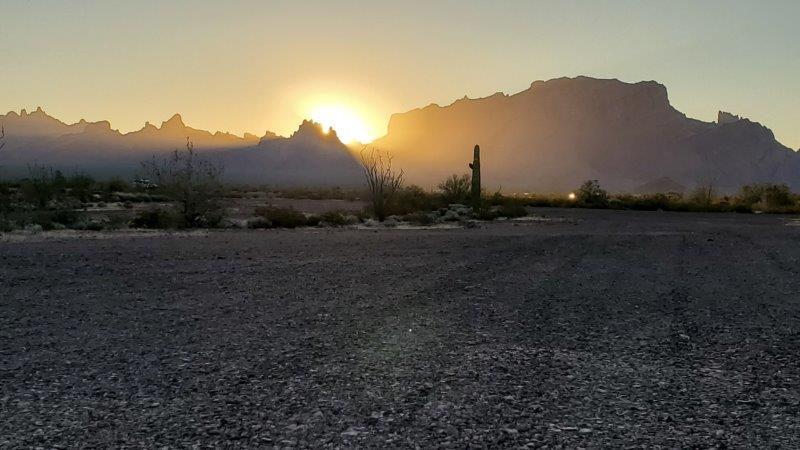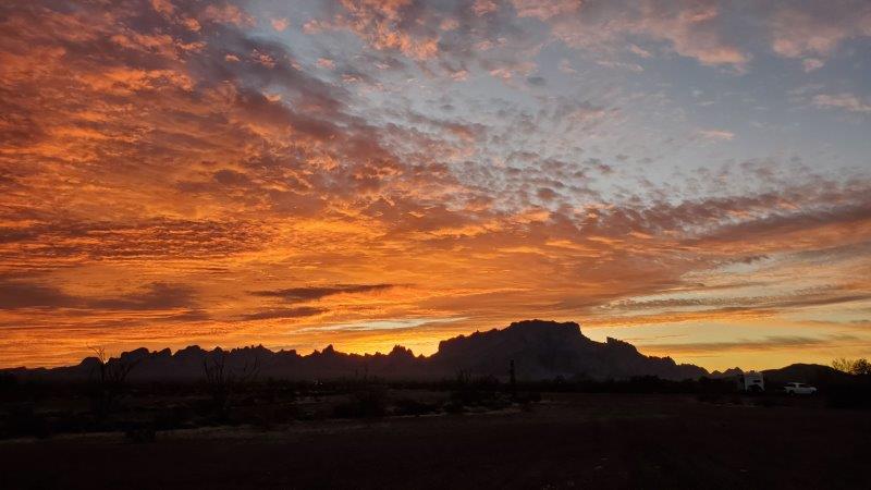 If you get up early enough, you can go outside with your cup of coffee and watch the sunrise.The sunrise was worth getting up for this particular morning.Then a few days later this spectacular sunrise over Signal Peak occurred. Wow!Once the sun is up, you put outside any solar devices you have that need to be charged. This is our Luci Light. It’s an inflatable LED light that we sometimes use when dark to conserve our coach batteries.