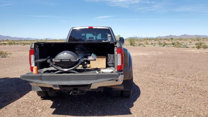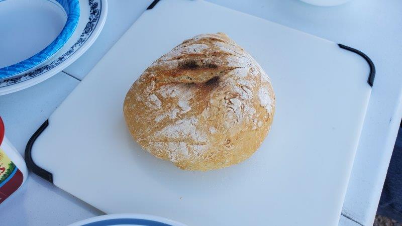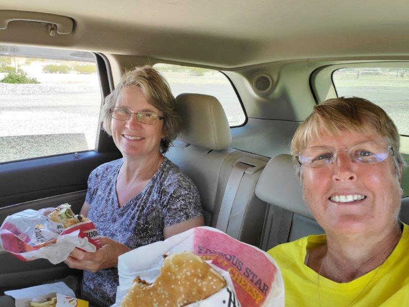 The tailgate of Dan and Amy’s truck is the perfect height for setting a grill on. There just happen to be steaks on the grill this evening.Steak, salad, fresh bread and wine…dining al fresco. We are getting pretty good at making homemade bread in my little clam-shell oven. We have probably baked 6 loaves in the past five weeks.We did venture out today to get some groceries (taking all precautions). We seized upon the opportunity to NOT cook today. None of us had ever tried Carl Jr’s, so we hit up the drive-thru. For fast foot, it wasn’t too bad. And did I mention we didn’t have to cook today?