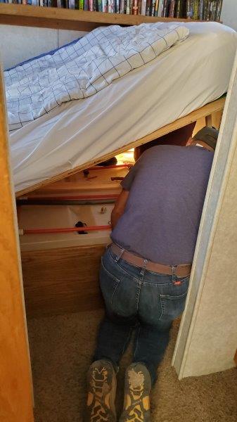 Jim (again invisible way back in the corner behind Dan) continuing his quest of installing 12 outlets wherever he thinks they are needed. Here one is going at the foot of the bed for a 12 volt fan. The bed is tilted up on the right side so the guys can access the bed base. You can see our fresh water tank under the bed!