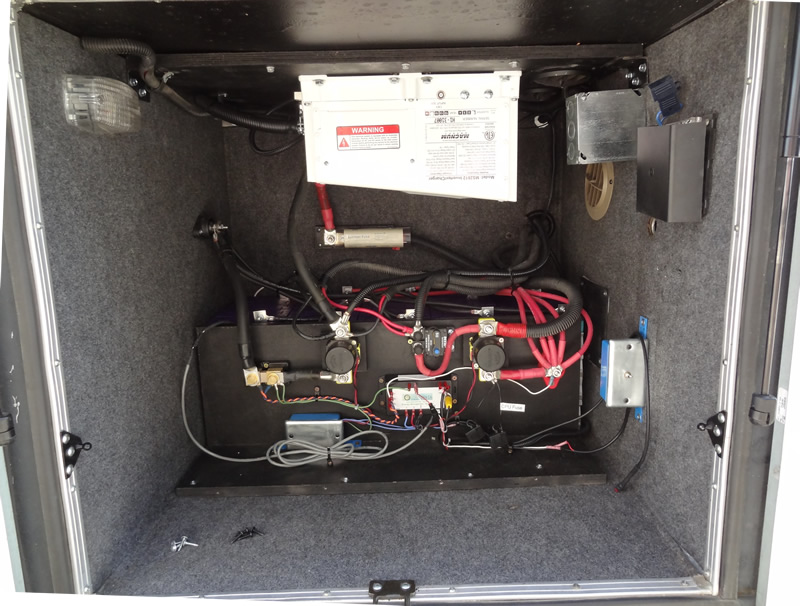 The battery compartment, inverter mounted to ceiling, batteries behind all the wiring. Yup, not easy to get at.