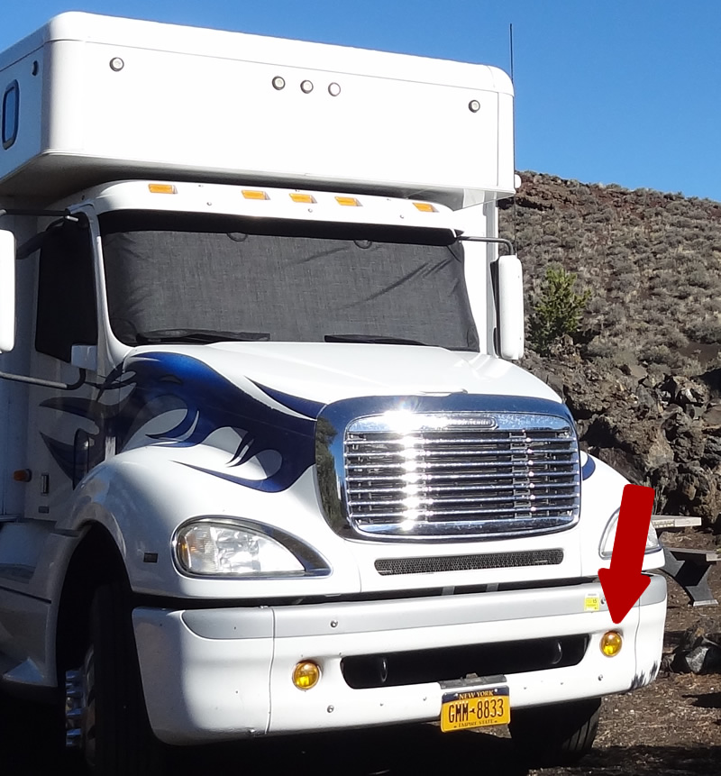 Plus we ordered a new running light. Why? On the way home a truck in the other lane exploded a tire and sent shrapnel all over. A big chunk hit the running light in the front bumper and knocked it completely out.