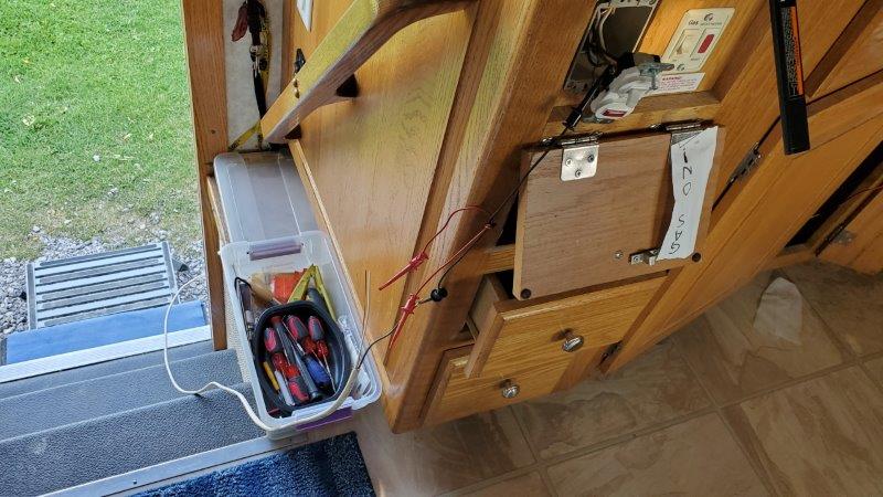 Somehow, Jim had to get a fresh wire between the two switches. In a house with a basement, that is not too terribly difficult. In an RV, it’s nigh on impossible.