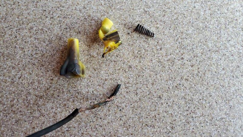 On the left is the cover to the junction box, soot and all. On the right are what is left of the wire nuts.