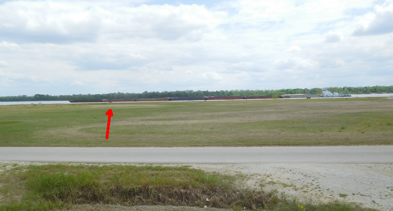I took this picture out of the window of the RV. Follow the red arrow and you can almost see Jim sitting on a bench watching the river traffic.